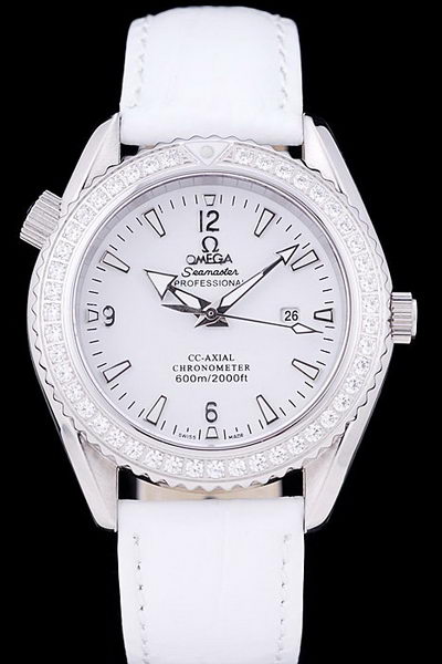 Bracelet: Omega heat embossed white patent crocodile leather strap with Omega inscribed polished stainless steel hook-buckle clasp